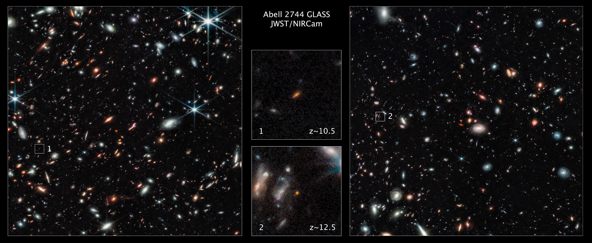 Two of the farthest galaxies seen to date are captured in these Webb Space Telescope pictures of the outer regions of the giant galaxy cluster Abell 2744. The galaxies are not inside the cluster, but many billions of light-years farther behind it. The galaxy labeled (1) existed only 450 million years after the big bang. The galaxy labeled (2) existed 350 million years after the big bang. Both are seen really close in time to the big bang which occurred 13.8 billion years ago. These galaxies are tiny compared to our Milky Way, being just a few percent of its size, even the unexpectedly elongated galaxy labeled (1).