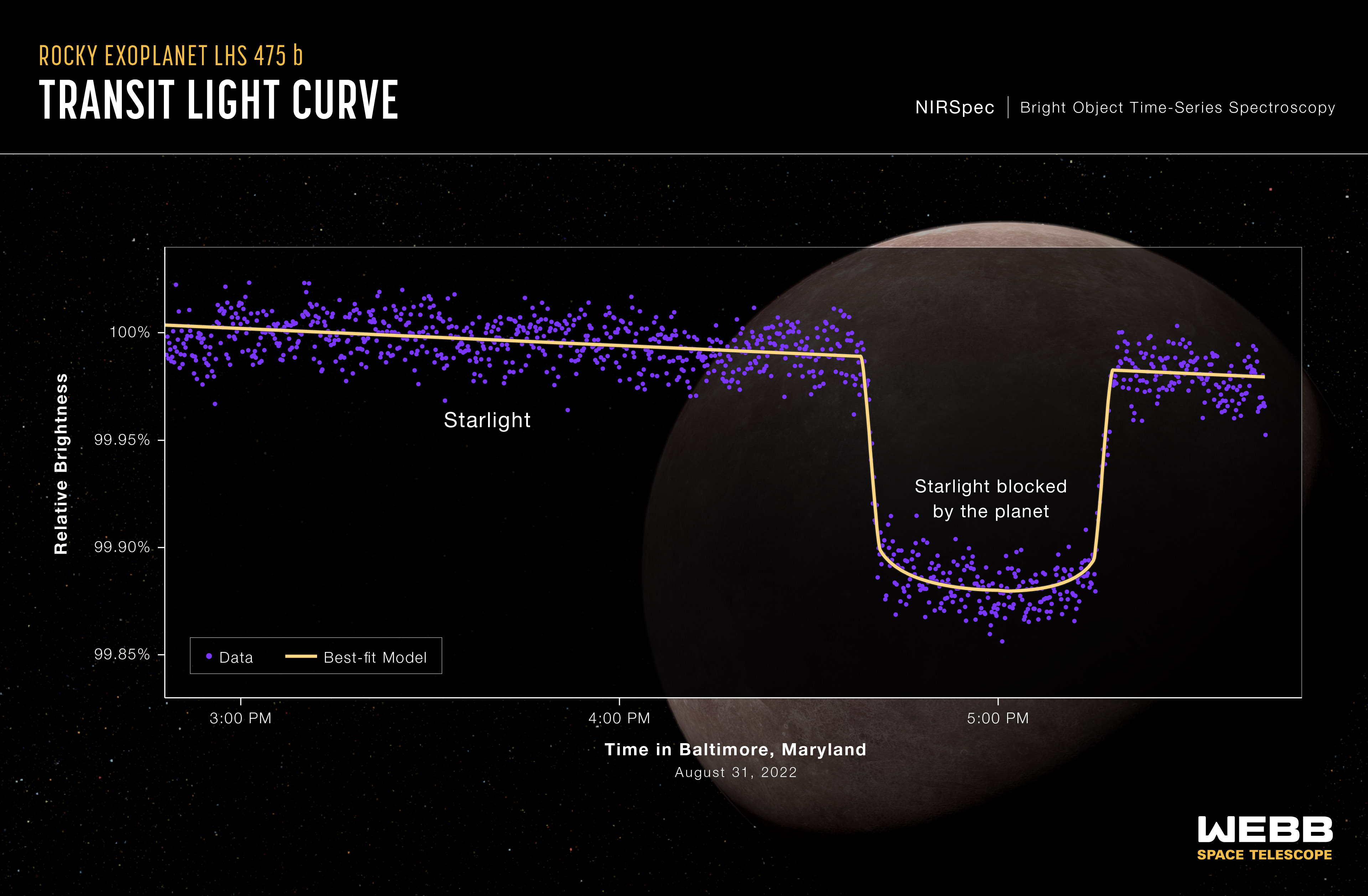 How do researchers spot a distant planet? By observing the changes in light as it orbits its star! A light curve from NASA's JWST Near-Infrared Spectrograph (NIRSpec) shows the change in brightness from the LHS 475 star system over time as the planet transited the star on August 31, 2022. LHS 475 b is a rocky, Earth-sized exoplanet that orbits a red dwarf star roughly 41 light-years away, in the constellation Octans. The planet is extremely close to its star, completing one orbit in two Earth-days. The planet’s confirmation was made possible by JWST's data.