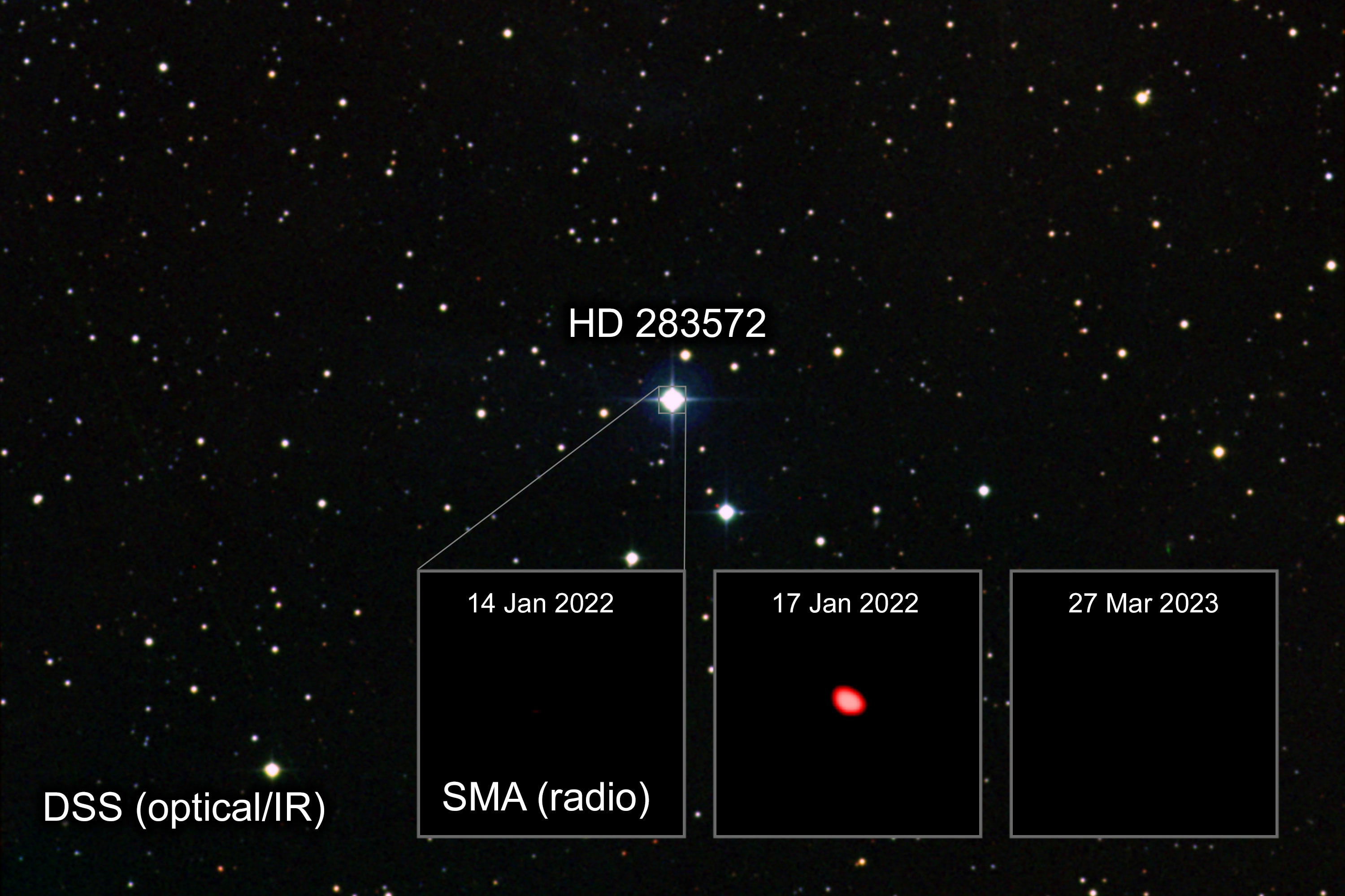 Labeled version - Images of the young star HD 283572 and its surrounding field. The large image shows optical and infrared data from the Digitized Sky Survey (DSS), and HD 283572 is the bright star near the middle of the image, highlighted by a square. The insets show Submillimeter Array (SMA) images centered on HD 283572 taken on January 14th and 17th, 2022 and March 27th, 2023. The red source in the middle panel shows the flare witnessed on January 17th. The star was not detected by the SMA on the other two days, nor in five other SMA observations not shown here. The DSS image is 20 arcminutes across (2.3 light-years at HD 283572's distance of 400 light-years) and the SMA images are 24 arcseconds across.