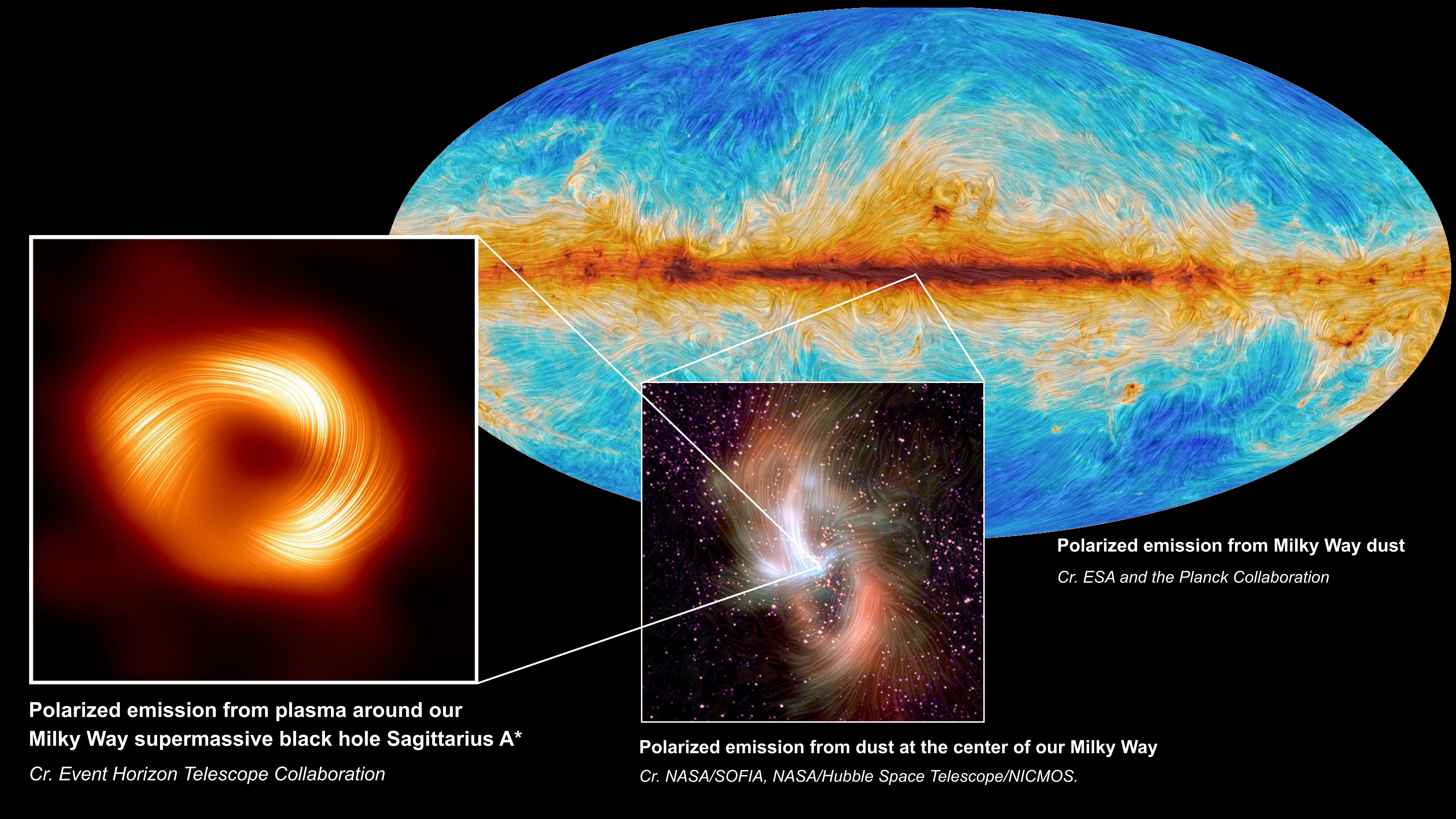 At left, the supermassive black hole at the center of the Milky Way Galaxy, Sagittarius A*, is seen in polarized light, the visible lines indicating the orientation of polarization, which is related to the magnetic field around the shadow of the black hole. At center, the polarized emission from the center of the Milky Way, as captured by SOFIA. At back right, the Planck Collaboration mapped polarized emission from dust across the Milky Way.
