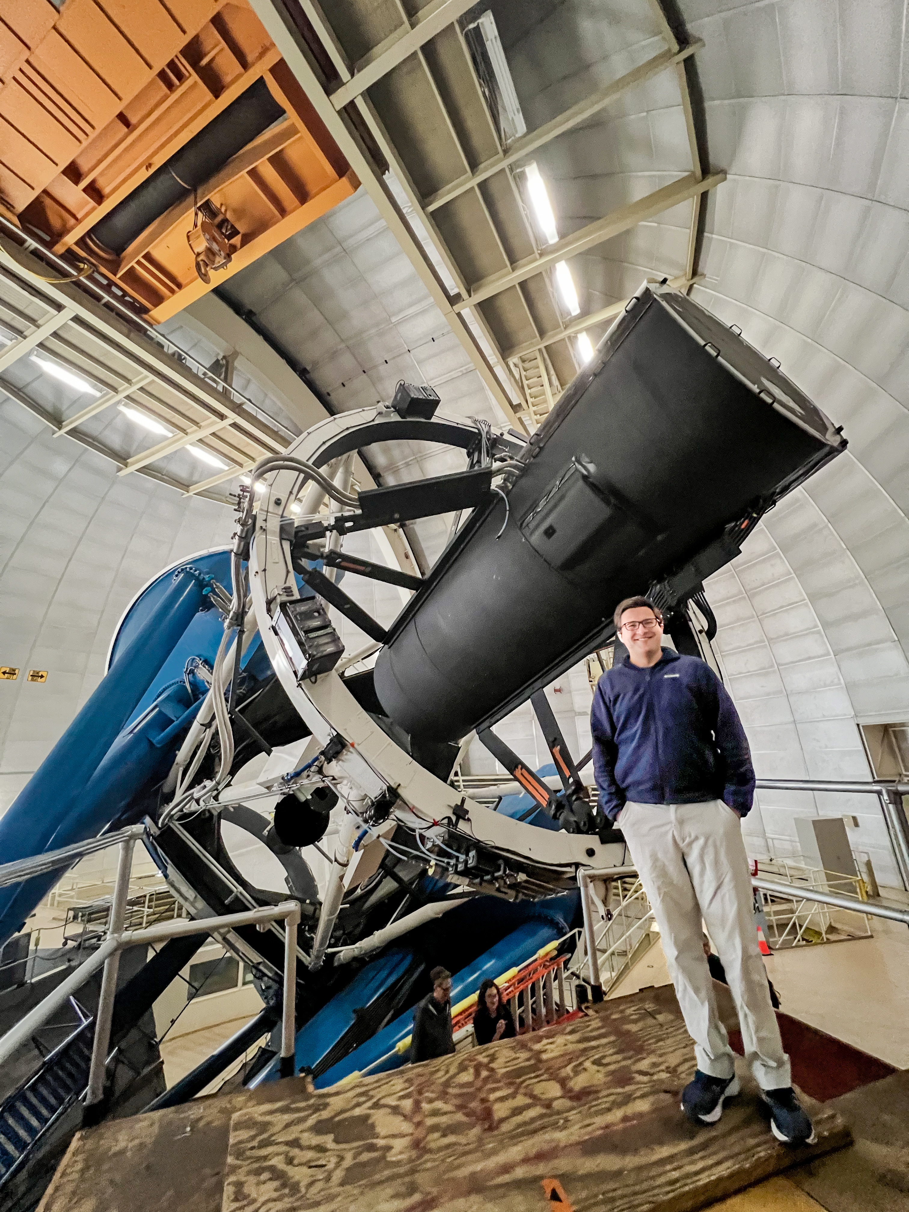 Andrew Saydjari, shown here with the Dark Energy Spectroscopic Instrument (DESI), works to make maps of the galaxy that tell scientists exactly where we are and how our galaxy is moving. He does this by extracting as much information as possible from large surveys like DESI, removing the noise and turning chaos into order. Courtesy Andrew Saydjari