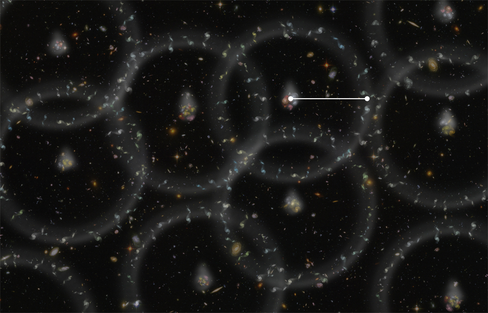 An artist's concept of the new measurement of the size of the Universe. The gray spheres show the pattern of the "baryon acoustic oscillations" from the early Universe. Galaxies today have a slight tendency to align on the spheres -- the alignment is greatly exaggerated in this illustration. By comparing the size of the spheres (white line) to the predicted value, astronomers can determine to one-percent accuracy how far away the galaxies are.