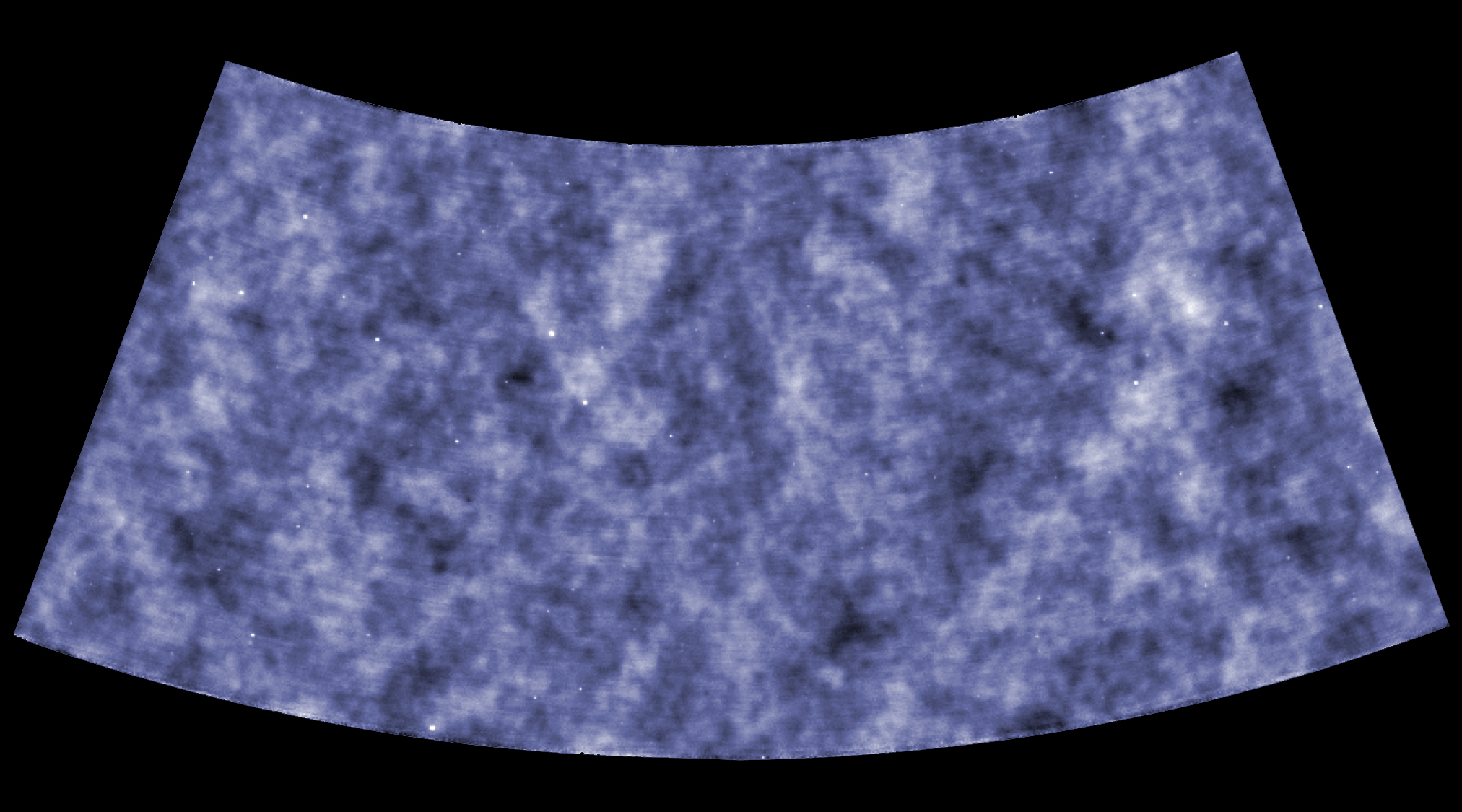 This image displays a portion of the South Pole Telescope survey of the cosmic microwave background (CMB) - the radiant light left over from the Big Bang. Points of light mark quasars and gravitationally lensed galaxies. The variations in the image are minute fluctuations in the intensity of the CMB. The fluctuations are caused by differences in the distribution of matter in the early universe at a time only 400,000 years after the Big Bang. The image is effectively a "baby picture" of the universe.