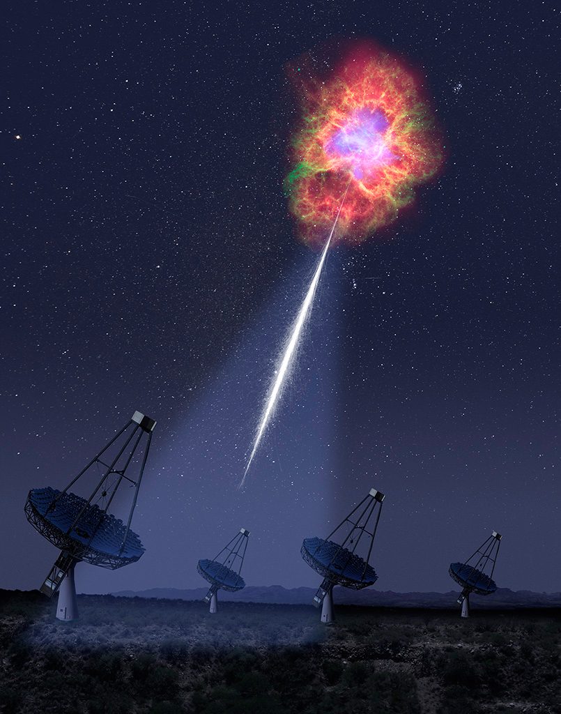 An artist’s rendering of the VERITAS array detecting gamma-ray pulses from the Crab Nebula.