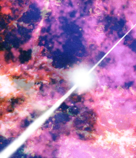 An artist's conception of the pulsar at the center of the Crab Nebula, with a Hubble Space Telescope photo of the nebula in the background. Researchers using the Veritas telescope array have discovered pulses of high-energy gamma rays coming from this object.