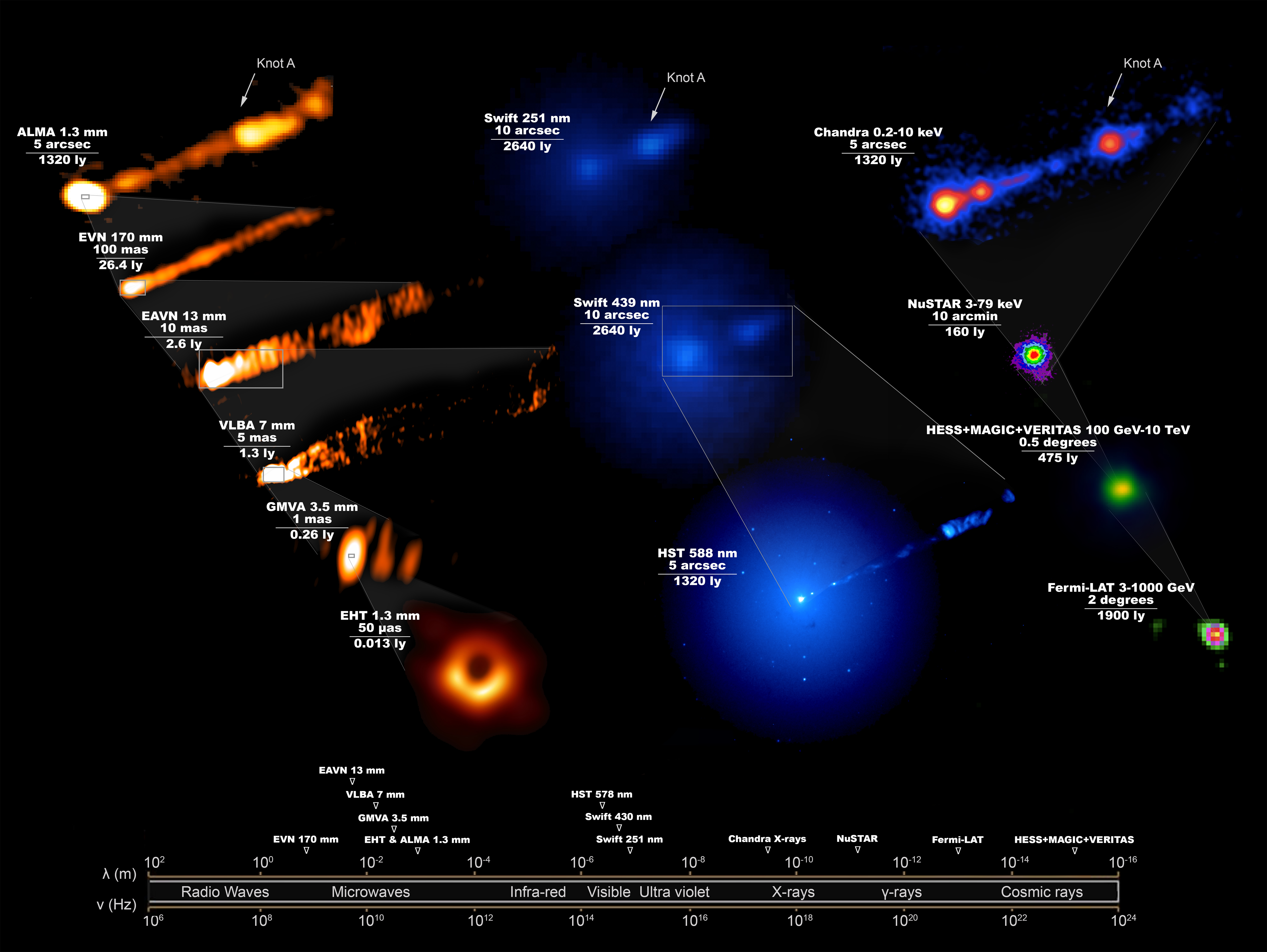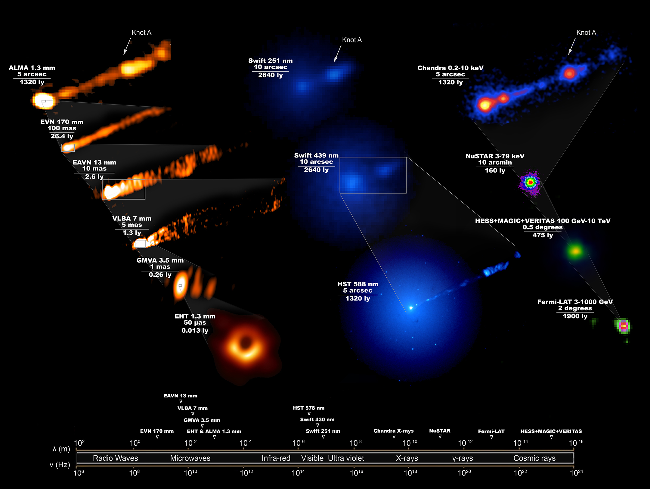 In April 2019, the Event Horizon Telescope project released the first direct image of a black hole in the galaxy M87. This series of images represent an extensive observing campaign by telescopes around the globe and in space of M87's black hole and the region around it. These telescopes cover the entire spectrum of light from radio waves to gamma rays. The images also range in scale from a fraction of a light year to hundreds of thousands of light years. These combined data will help scientists gain crucial insight into the black hole's properties.