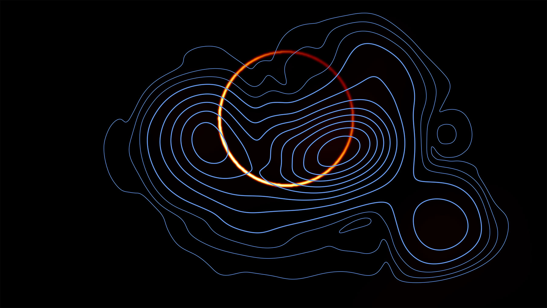 The emission from M87 has now been resolved into a bright, thin ring (orange colormap), arising from the infinite sequence of additional images of the emission region, and the more diffuse primary image, produced by the photons that come directly toward Earth (in blue contours). When viewed at the imaging resolution of the Event Horizon Telescope, the two components blur together. However, by separately searching for the thin ring, it is possible to sharpen the view of M87, isolating the fingerprint of strong gravity.