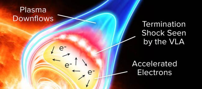 The new VLA observations support the idea that the acceleration occurs in a region of the flare where rapidly flowing solar gases impinge on dense magnetic field loops. This creates a shock wave, similar to the sonic boom of an airplane except that it remains in one place as a so-called "termination shock." Electrons are repeatedly pummeled by the shock into higher and higher speeds. The VLA observations of this shock closely match computer simulations that produce such a phenomenon in flares.